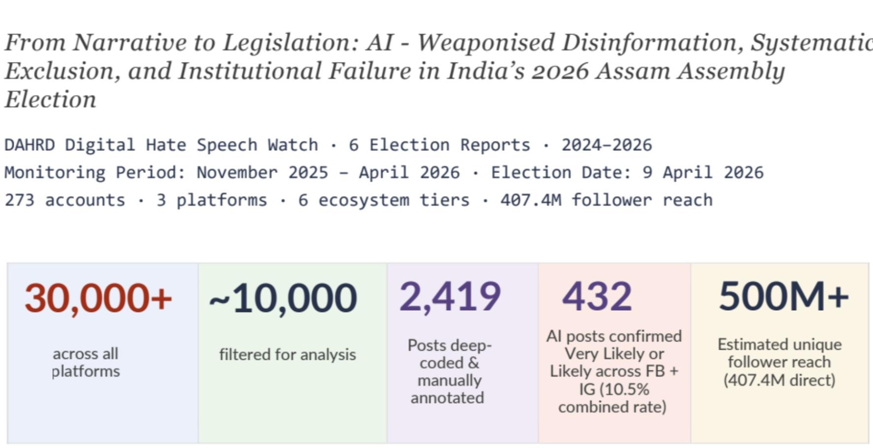 An election monitoring report has flagged what it calls an “unprecedented convergence” of AI-driven disinformation, electoral exclusion, and state-backed narratives in the run-up to the 2026 Assam Assembly elections, targeting the ‘Miya’ Muslim community. The report said that the 432 AI-generated posts across Facebook and Instagram had a combined network reach of 407.4 million followers.
